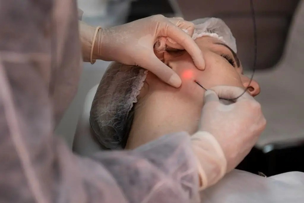 Limpeza e preparação da área de tratamento. Aplicação de gel condutor para otimizar a penetração do laser.